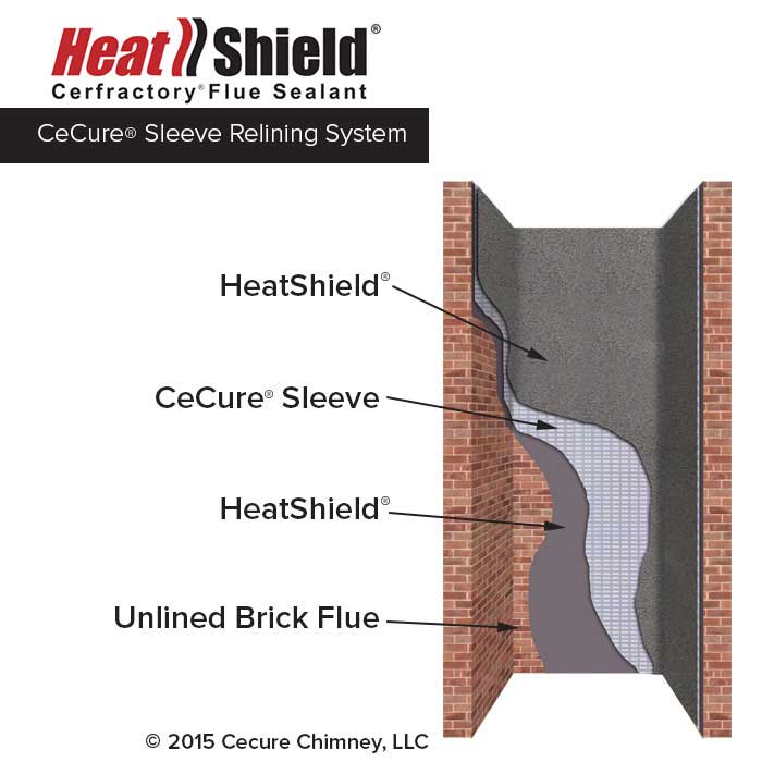 - The CeCure® Sleeve Relining System. If your chimney liner has significant damage or you don’t have a liner, we’ll suggest the CeCure® Sleeve Relining System. During this process, a coating of HeatShield® Cerfractory® Flue Sealant is applied to the flue walls and then the CeCure® Sleeve – a ceramic insulation sleeve reinforced with stainless steel fabric – is lowered into the flue.